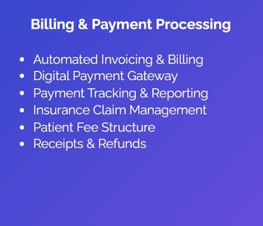 Billing & Insurance Processing : Simplify consultation billing, insurance claims, payment tracking.