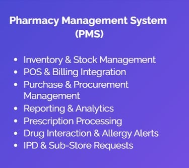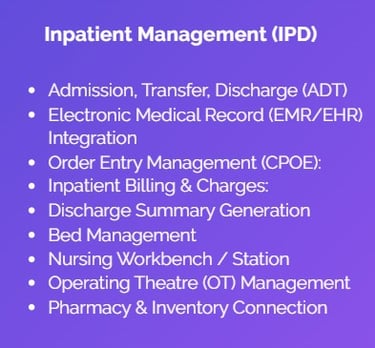 (HMS) integrate clinical, administrative, and financial operations of hospitals into one platform. Hospital systems manage patient registration, admission and discharge, appointment scheduling, billing and insurance claims, laboratory management, pharmacy operations.